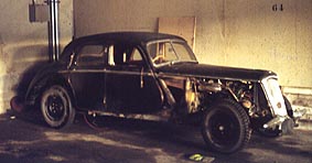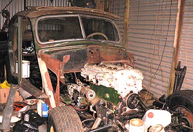 Gammelt bilde av chasiss hvor Jaguarmotor og drivverk var montert. Bilen i garasje i Horten uferdig i 2006.